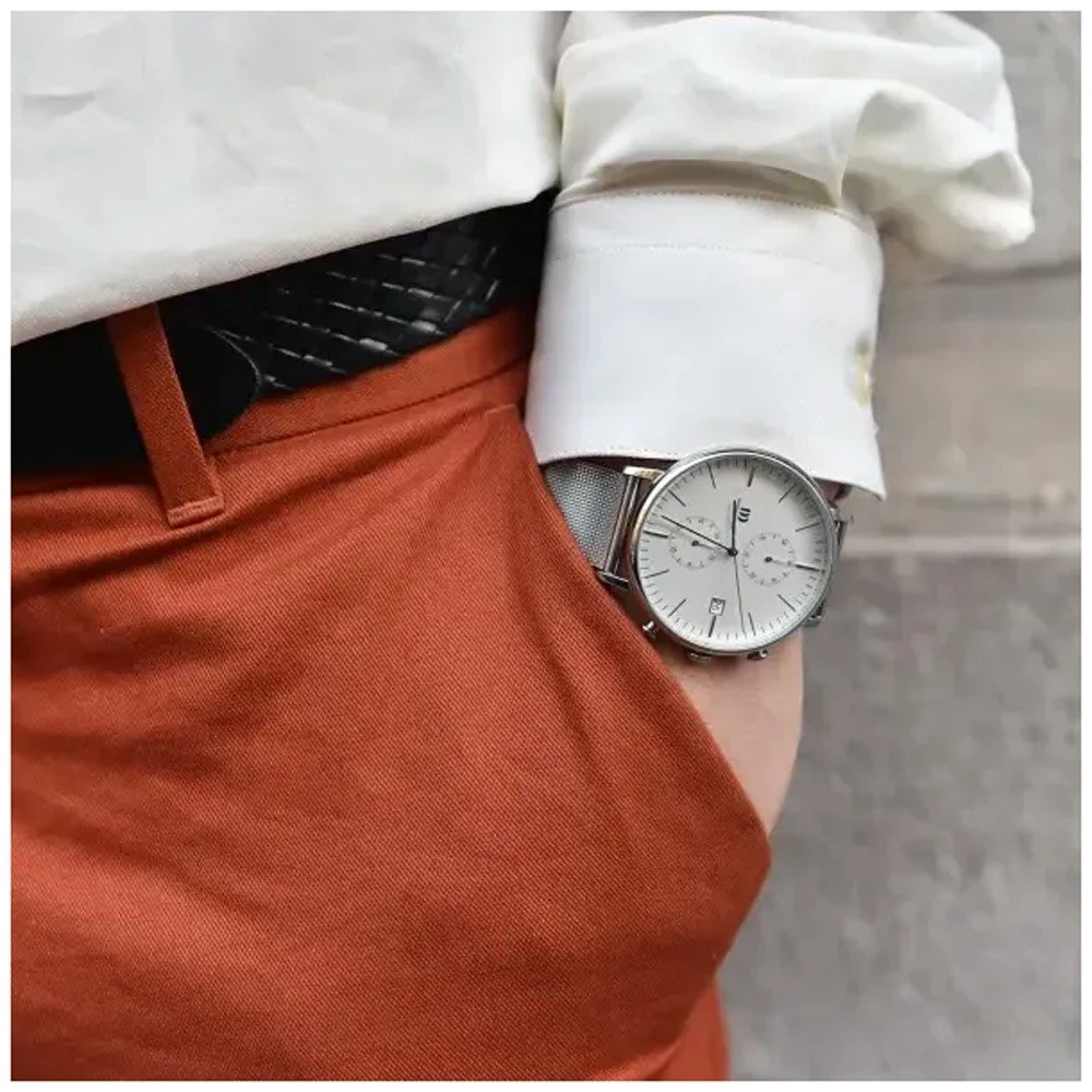 This Danish Design watch has a case made of stainless steel with a diameter of 42 mm and is fitted with a metal band. Inside the case lies a Seiko Instruments Inc. movement and the watch features a Mineral crystal.